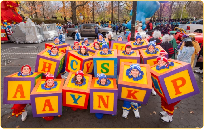 The Alphabet Block Clowns made their first Macy's Thanksgiving Day Parade appearance in the 1993 Parade. Designed by Martha Hally, the clown group featured an array of colorful toy block clowns, who in correct formation, could wish Parade viewers a "Happy Thanksgiving!", or "Macy's Parade". The group was led by the namesake Professor, who kept his toy blocks in line en route to 34th Street.