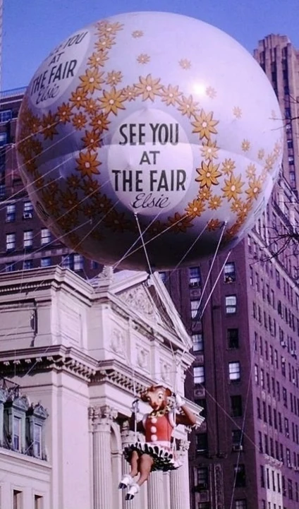 Eight years later, Elsie would make her balloon debut in the 1963 Macy's Thanksgiving Day Parade, alongside Dino the Dinosaur from the Sinclair Oil Corporation. The balloon shows Elsie, a 12-foot paper maché figurine made by Bliss Displays, riding a trapeze attached to a 27-foot balloon.
