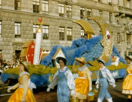 Elsie the Cow made her Macy's Thanksgiving Day Parade debut in 1955 with a new float titled Elsie Jumps Over The Moon which takes inspiration from the classic nursery rhyme Hey Diddle Diddle. The float was retired after its inaugural appearance.