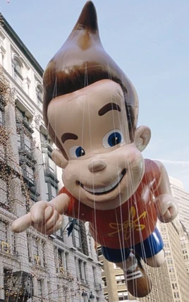The Jimmy Neutron balloon would debut in 2001 as one of five brand-new giant balloons that year. The design shows Jimmy on his Thanksgiving hiatus from his home in Retroville, gussied up with his signature styled hair and iconic red t-shirt as he blasts down the Parade route, in hopes of finding new discoveries along the way. The balloon's design is also known to be the first giant helium balloon based on a CGI character (though the distinction of the first CGI character in the Parade belongs to Heimlich, who appeared as a falloon in 1998). Jimmy also made an appearance in costume form on the Macy's Toon Balloon-Abration float in 2001 as well.