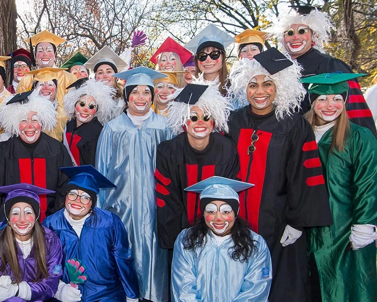 The Class Clowns made their debut in the 2000 Macy's Parade, graduating from Clown U. for learning the FUNdamentals of being a clown. The troupe sported colorful graduation gowns and matching hats, and were led by their "Wacky Einstein" professors. The group would generally appear alongside the Alphabet Block Clowns unit, spelling out a colorful Thanksgiving message.