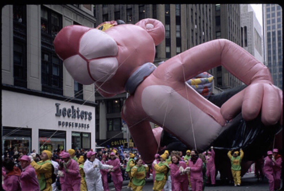 The Pink Panther balloon experienced a limp wrist and punctured hand in 1993 and 1994 respectively, but continued to catch waves as the coolest cat above Manhattan.[12][13]