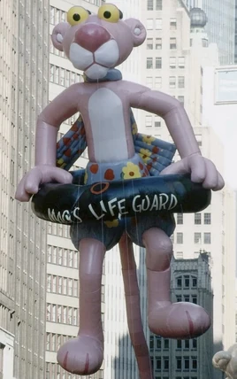 With the original film's 25th anniversary on the horizon, the Pink Panther later made his debut as a giant helium character balloon in 1988, prowling through Manhattan as a 72-foot tall helium inflatable. The colossal balloon—which was constructed by the Aerostar division of Raven Industries in Sioux Falls, South Dakota—depicted the Pink Panther holding true to his tradition of doing the wrong thing at the wrong time, wearing floral surfer shorts more suitable for summer weather. Keeping the Panther afloat is a 40-foot inner tube which identifies him as Macy’s official lifeguard.[2]