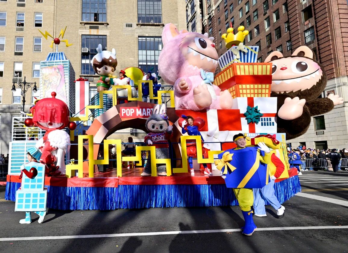 POP MART made its debut in the 2025 Macy's Thanksgiving Day Parade, celebrating its 15th anniversary with a new float. Titled "Friends-giving in POP CITY," the float takes spectators to the whimsical world of POP CITY, where the mischievous Labubu and Mokoko—in the form of 16-foot tall "fuzzy" inflatable sculptures—work tirelessly to turn their home into a brightly-wrapped present for their new friends. Also on the float are other popular POP MART figures including SkullPanda, Peach Riot, Dimoo, Molly, and Duckoo.
