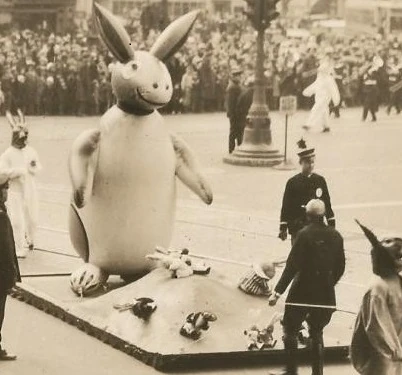 In 1933, Tony Sarg would get to work on an inflatable in the likeness of a rabbit, which would make its first hop down the route in that year's Parade. Not much is known about the inflatable, but like many other balloons around this time period, it was retired after its only appearance, and disposed of sometime afterwards. This balloon made a one time appearance.