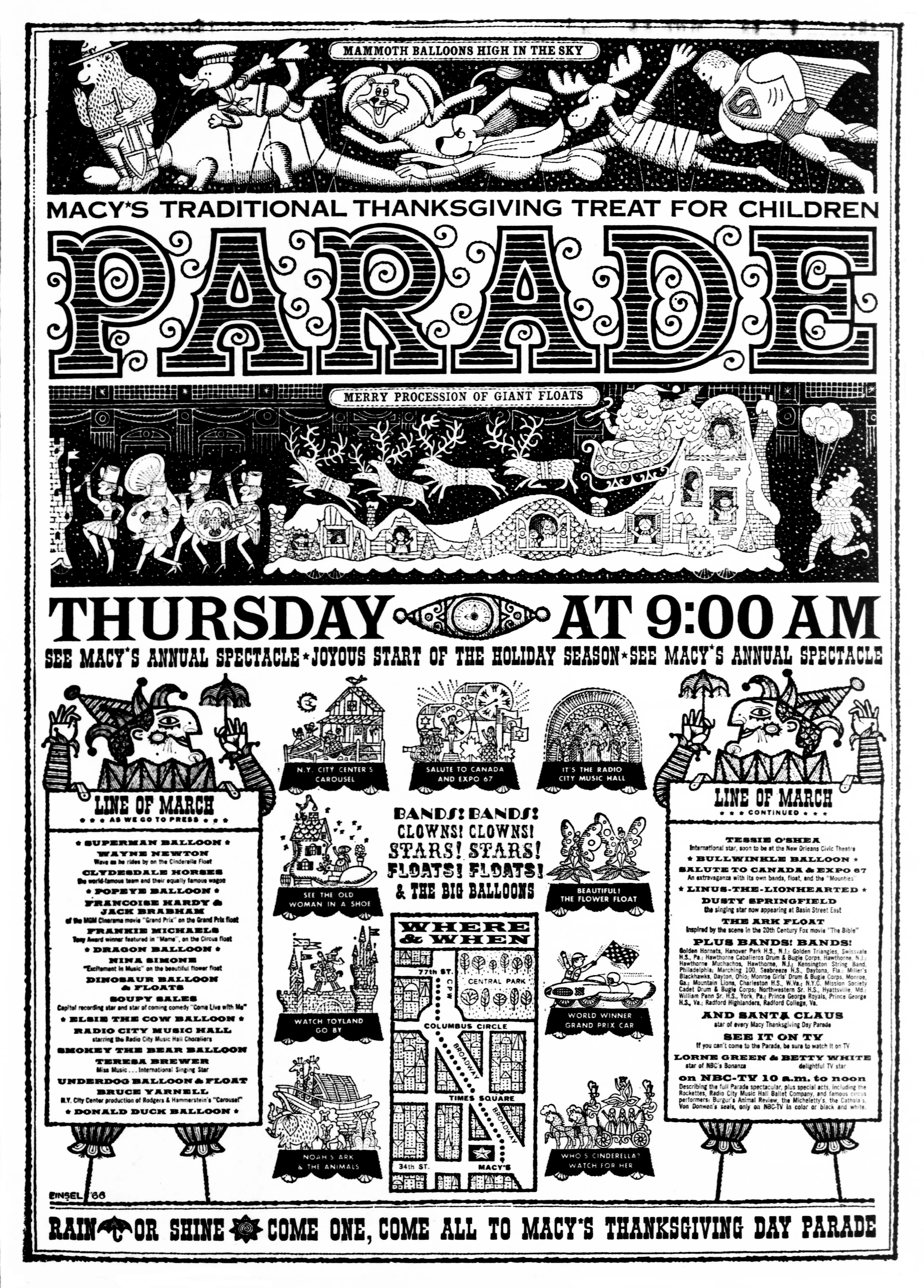 Listed below are the parade elements that appeared in the 1966 Macy’s Thanksgiving Day Parade. They are categorized by unit type, with their respective sponsors in bold. Home locations of talent ensembles are featured in brackets, and guest star’s float appearances are indicated in bold.