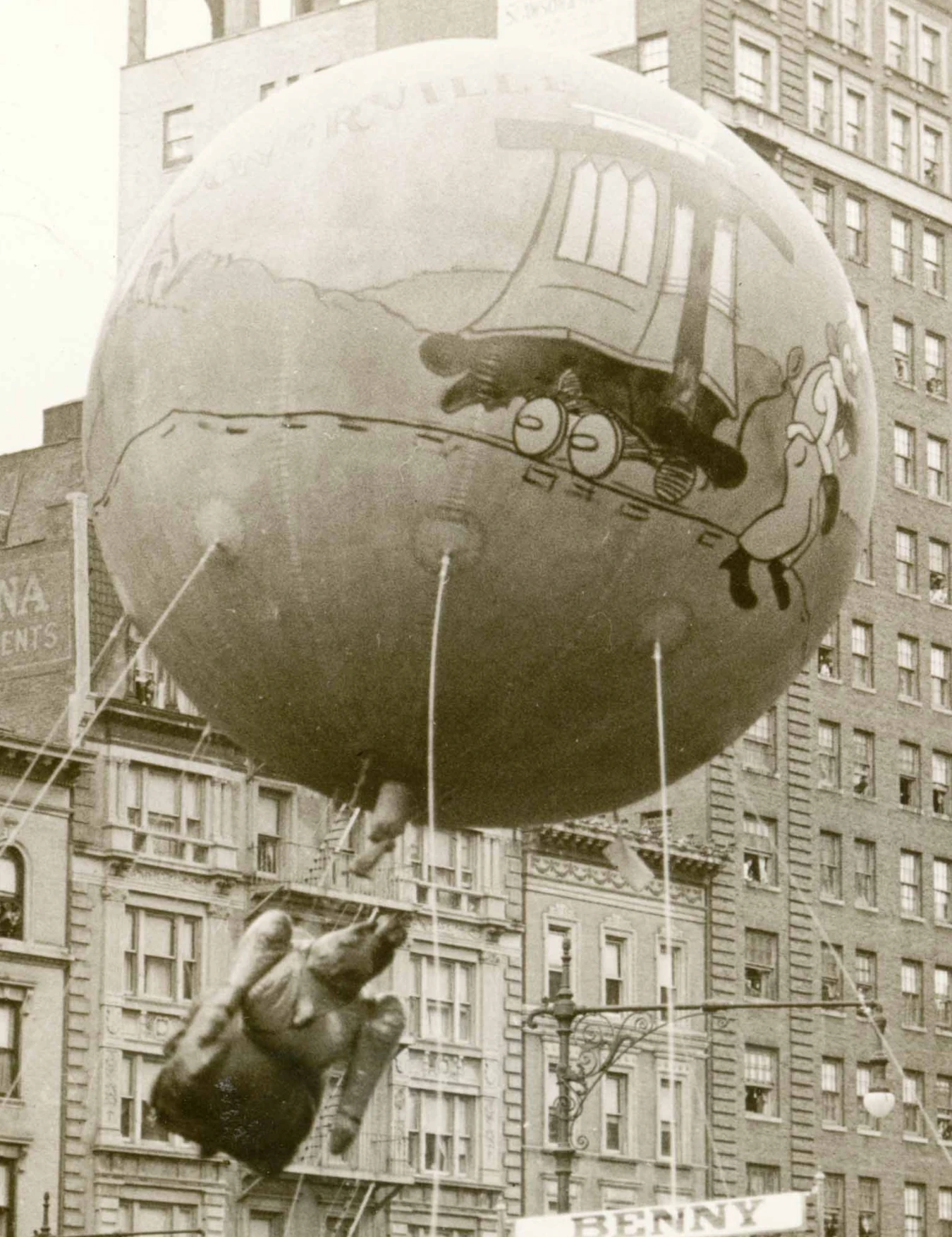Tonnerville Folks was featured by a balloon in the 1930 Macy's Parade, featuring the world of Toonerville and its iconic rickety old trolley. Skipper swung below the spherical balloon as a Paper-Mache figures alongside other funny page favorites in the advertised "Comic Parade."