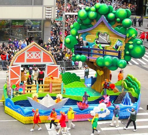 Over its 8-year partnership with the Parade, Universal Kids has had three floats participate. The first float debuted in 2012, and was entitled "Daytime, Playtime, Nighttime Too". This float was made to look like a child constructed it out of various arts and crafts materials such as construction paper, popsicle sticks, buttons, felt, and more. At the front of the float, the "Sunshine Barn" represents the networks' early-morning programming block, "The Sunny-Side Up show". At the rear, the "You and Me Treehouse", represents "The Goodnight Show", the network's lineup of nighttime entertainment. In 2015, the float was given a refreshed look, now adding more arts and crafts elements, such as paper plates and bowls, and colored pencils, as well as the removal of the sun, moon, and windmill from the float's previous incarnation. Additionally, the float was renamed "Free To Play". It would retire after the 2016 Parade and was disposed of not long after.